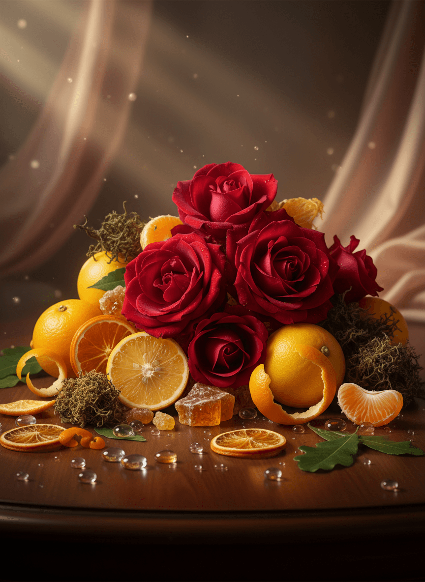 RoseAgrumesGourmandPatchouliBoiséÉpicé chaudTerreuxFloralDouxBalsamique